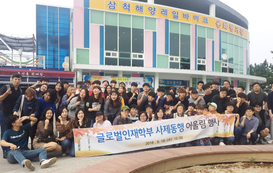 글로벌인재학부 사제동행 행사 개최 글로벌인재학부에서는 2018학년도 글로벌인재학부 신입생들과 교수님간에 유대감을 갖고 서로 신뢰관계를 향상시켜 소통과 공감의 시간을 통해 대학 생활의 적응력을 향상시키고자 '글로벌인재학부 사제동행 행사'를 개최하였습니다. 이번행사를 통해 사제간의 친밀감 형성 및 화합과 친목을 다질 수 있는 좋은 시간이였다. - 일시 : 2018. 09. 19(수) 14:00~19:00 - 장소 : 삼척 레일바이크(삼척시 근덕면)